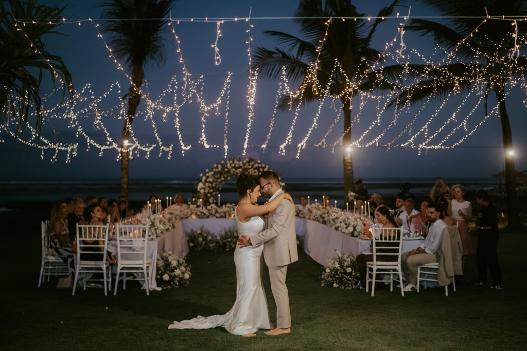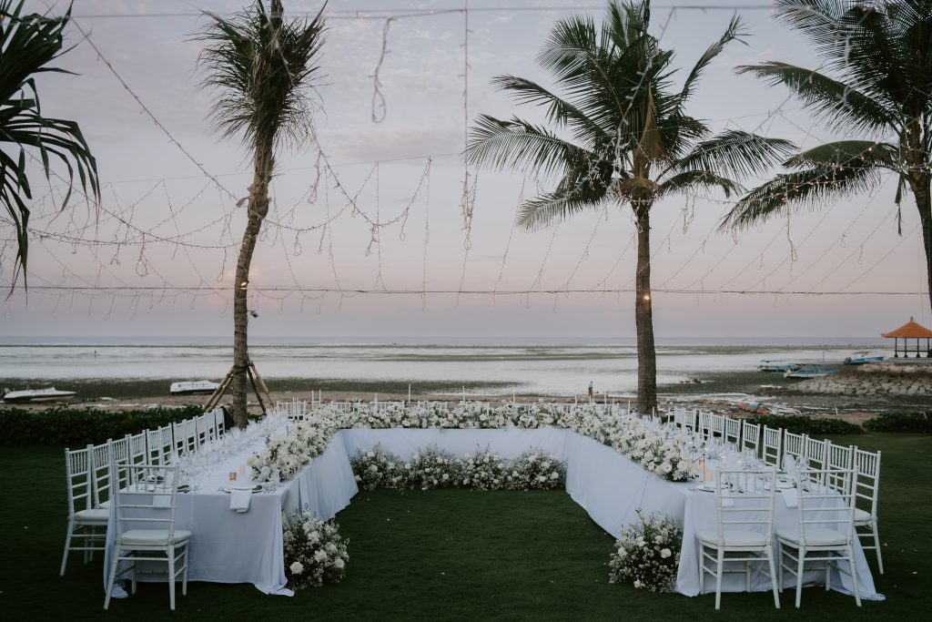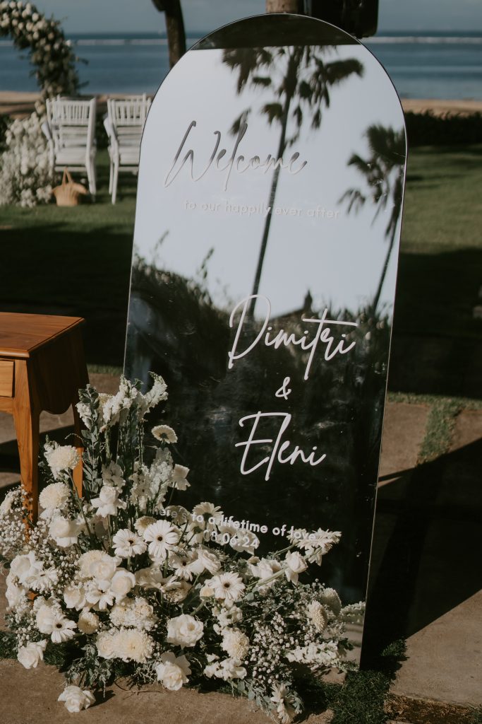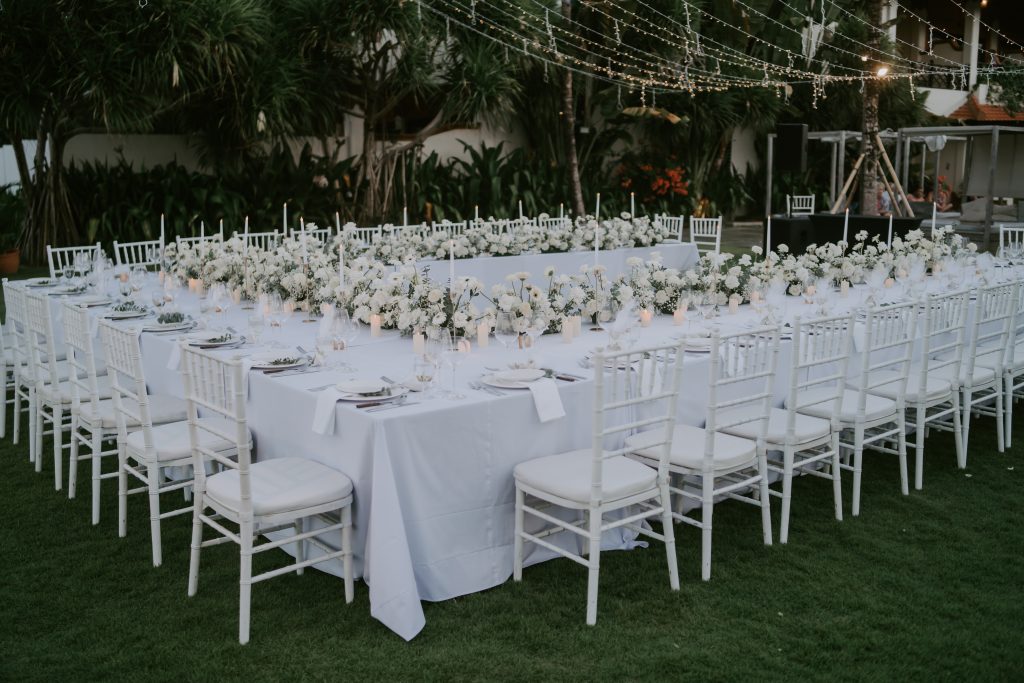 Eleni & Dimitri’s Wedding January 27, 2026January 27, 2026 Bali Wedding Rental Product Featured : Tiffany Chair White Long Banquet Table Black / White Electric Ivory Taper Candle Electric Swinging Candle Tall & Short Marie Candle Holder Set Gold Bamboo Vase Glass Madeline Dining Plate Shiny Silver Fairy Light Warm Yellow