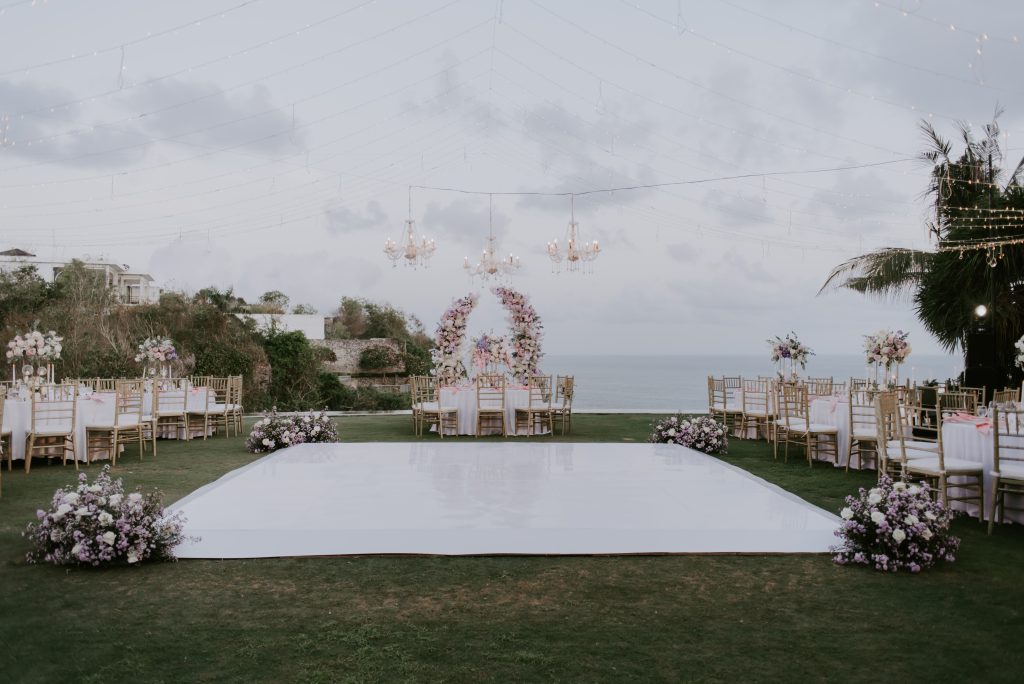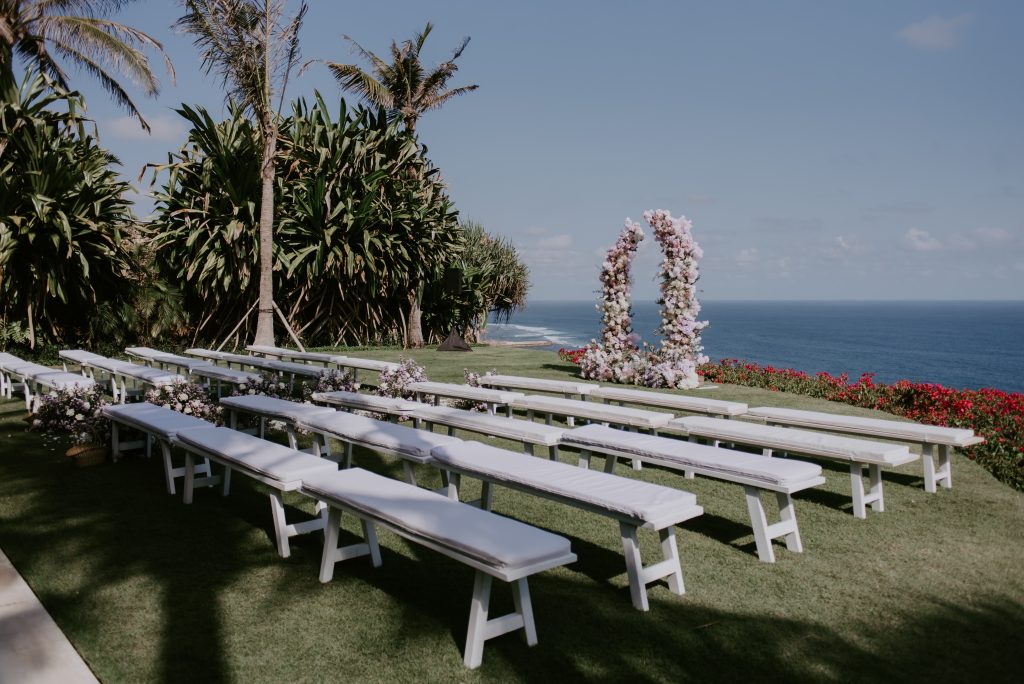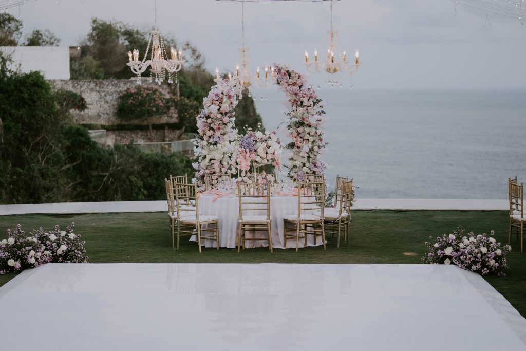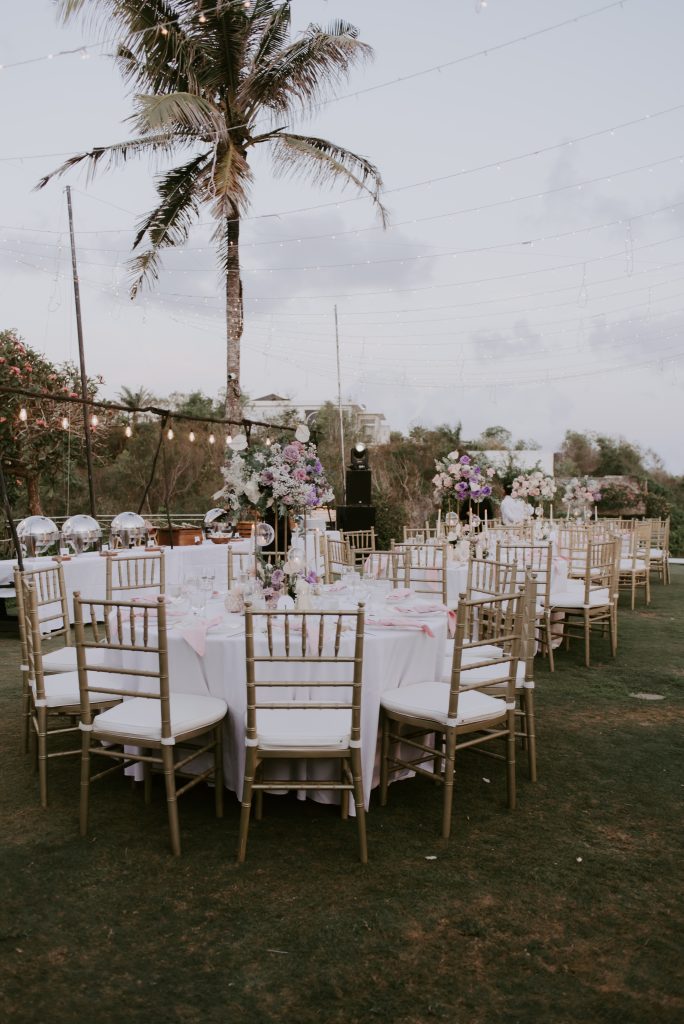 Emma & Sam’s Wedding February 23, 2026February 23, 2026 Bali Wedding Rental Product Featured : Tiffany Chair Champagne Round Banquet Table Black / White Chandelier Natalin Silver Napkin Pink Wooden Bench 180cm White Lumiere Charger Plate Noble Shiny Gold Fairy Light Warm Yellow